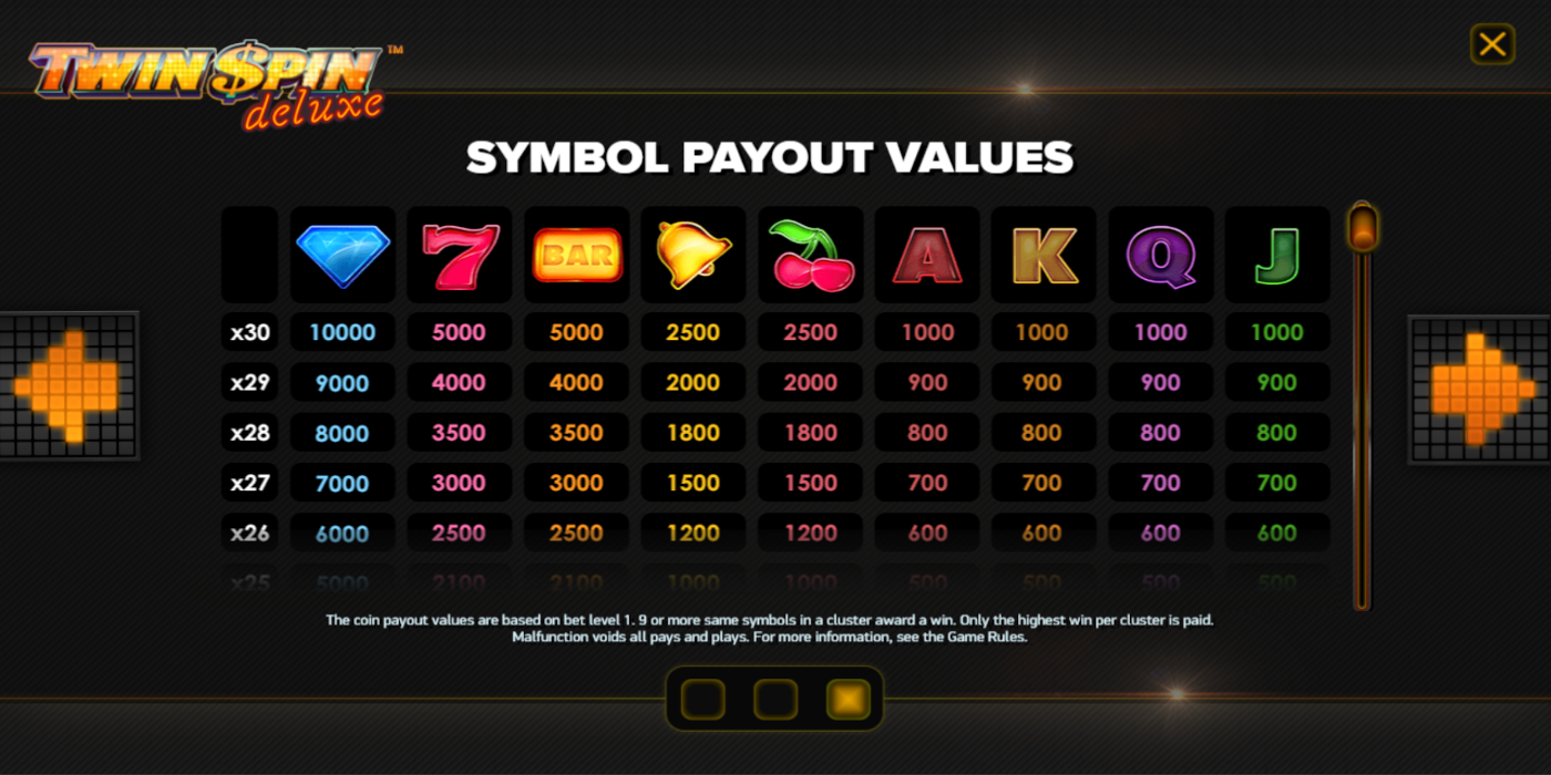 - Twin Spin Deluxe uses the Cluster Pays mechanism, instead of the traditional payline system, where matching clusters of symbols activate a winning pay-out.